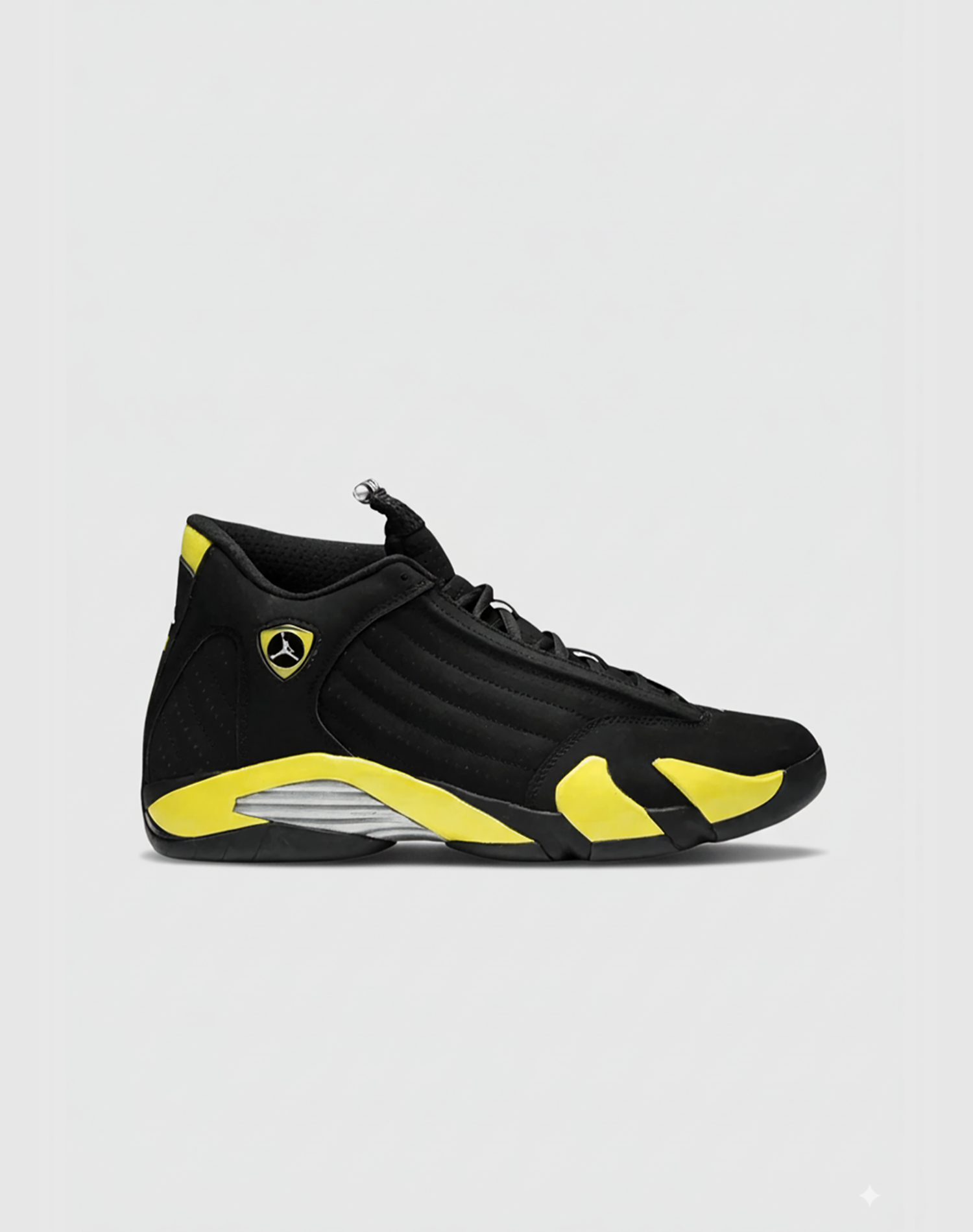 The upper is crafted from a mix of smooth black nubuck and synthetic materials, offering durability and a stealthy matte finish. Vivid yellow accents electrify the look, appearing on the midsole, branding, and heel, adding a fierce pop of color that echoes the powerful, Thunder, aesthetic. Signature Jumpman logos, including the Ferrari-inspired shield on the side, honor the AJ14’s roots in performance and innovation.